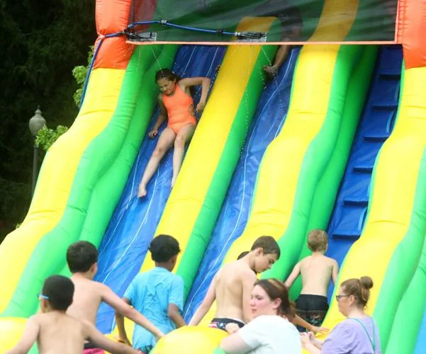 Soccer goals, a pool-sized arena for dodgeball and inflatable waterslide are set up on the campground.